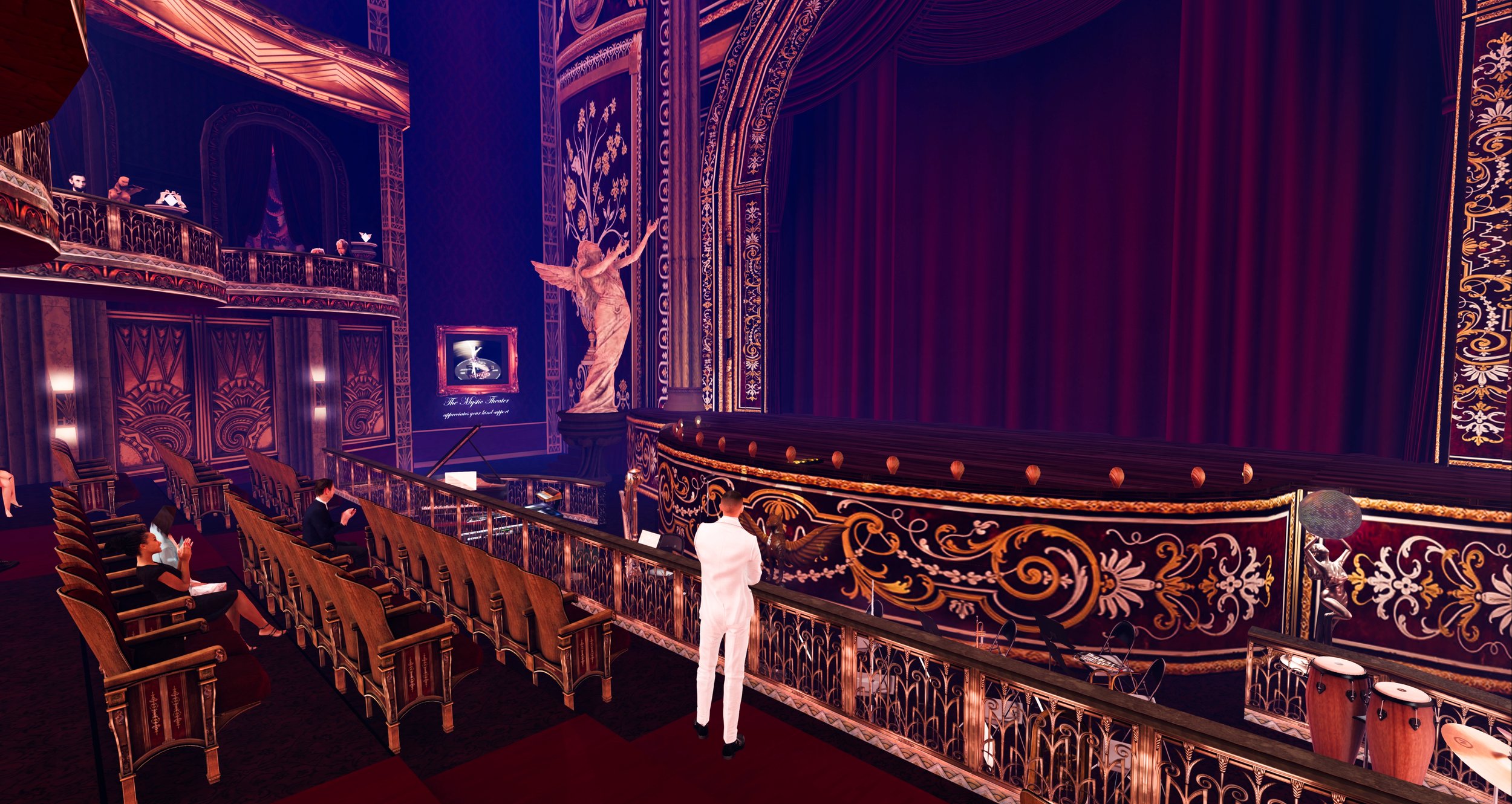 A theatre with crimson interiors. Here, a stunning winged angel statue poses mid-fall by the staircase, holding a flaming torch — equal parts grace and agony.