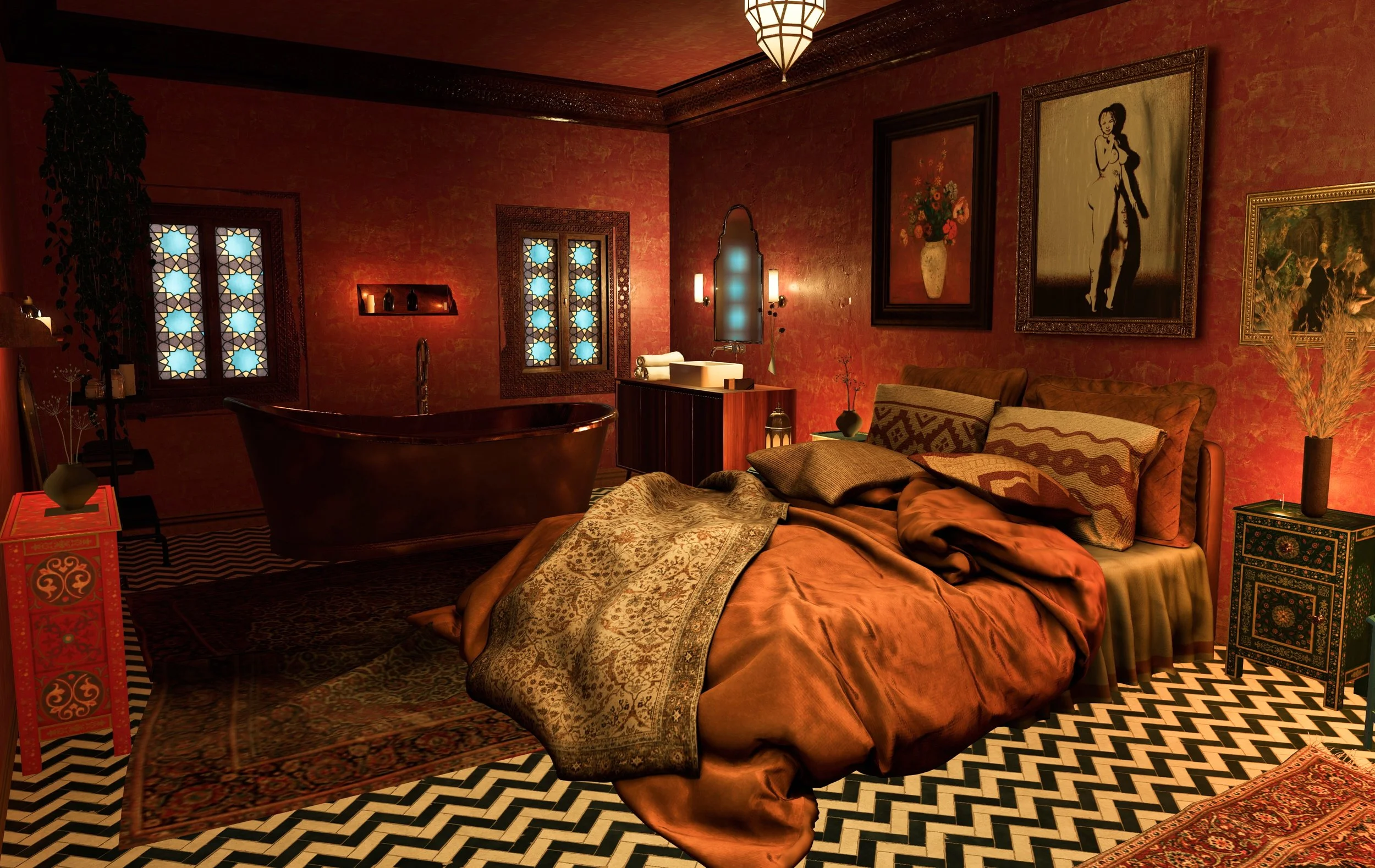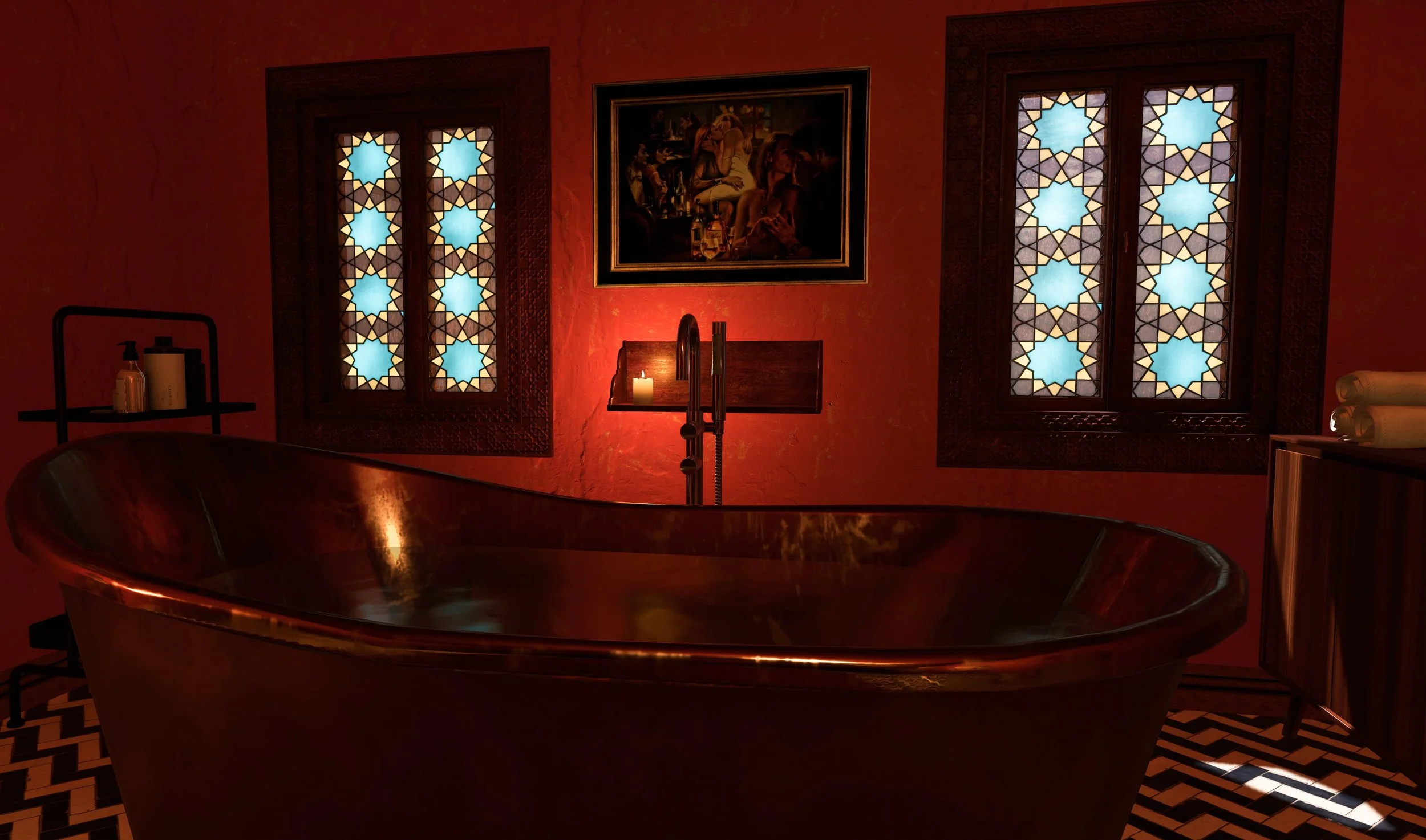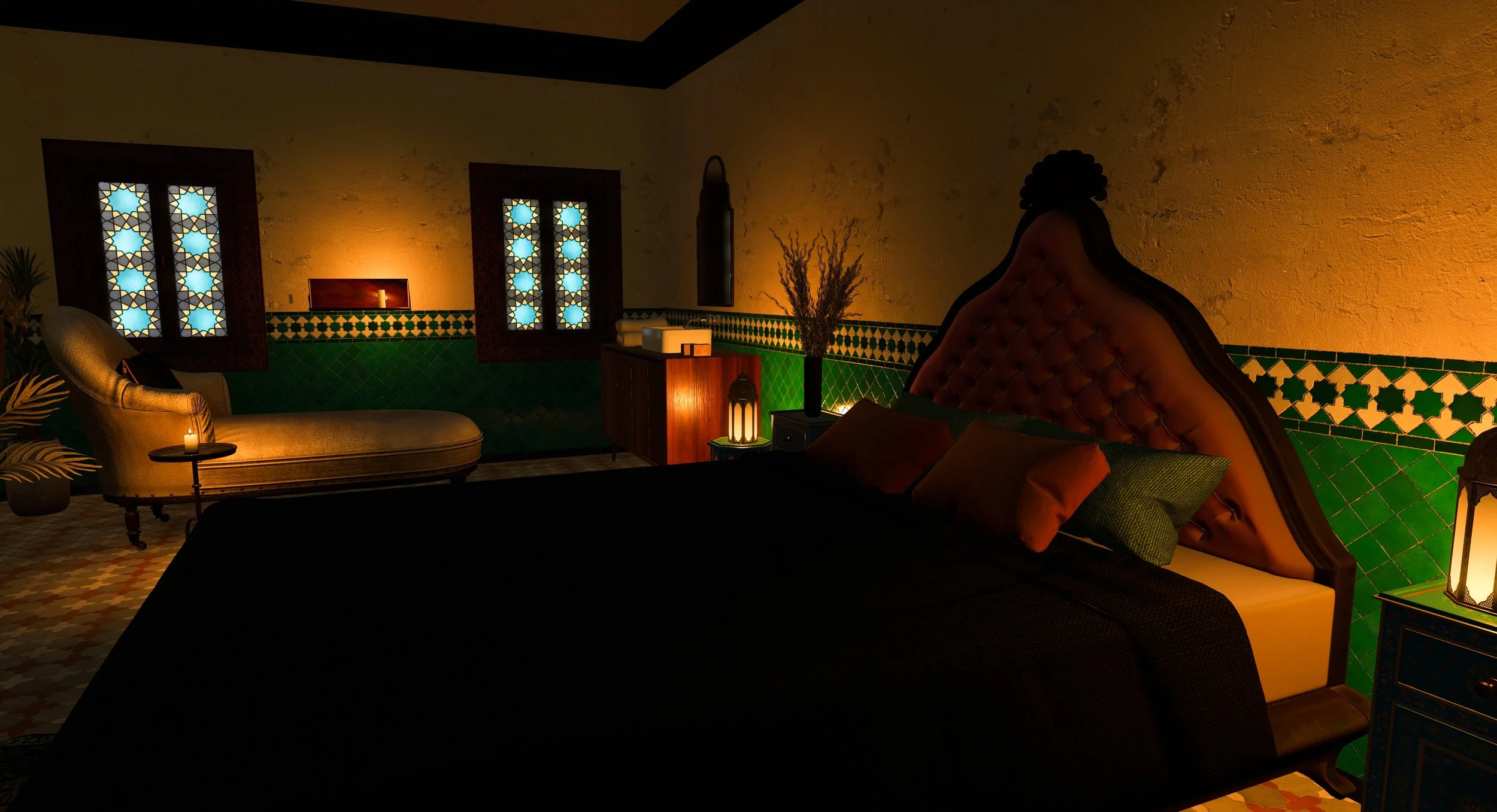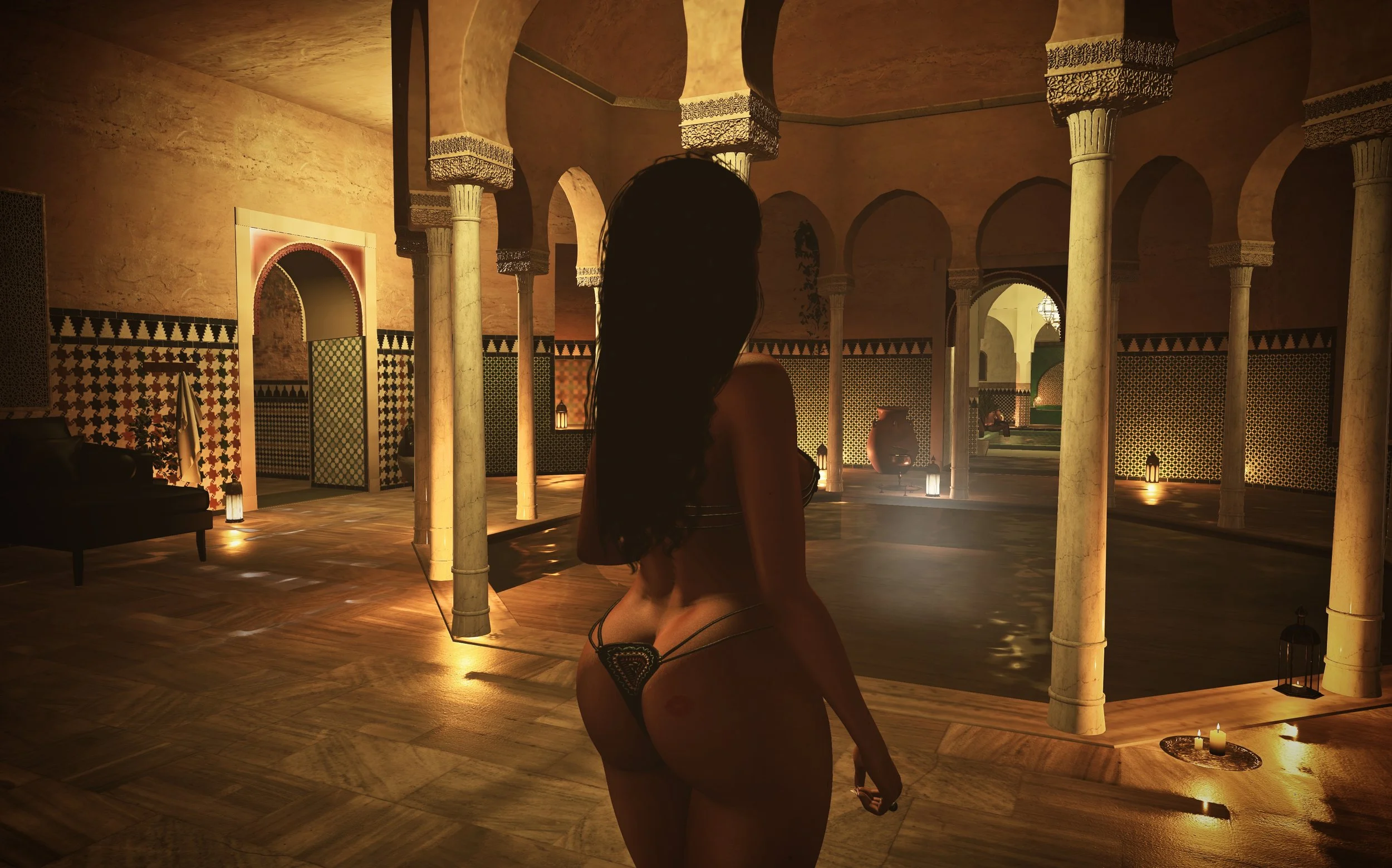 The first thing that really stands out is the finish. Nur Hammam nails it with its choice of materials and its understated elegance. The tilework is stunning, and the textures tell a story – think worn plaster, patterned borders, deep greens and reds, and a candlelit glow that feels more like a high-end boutique spa than a typical SL setup.