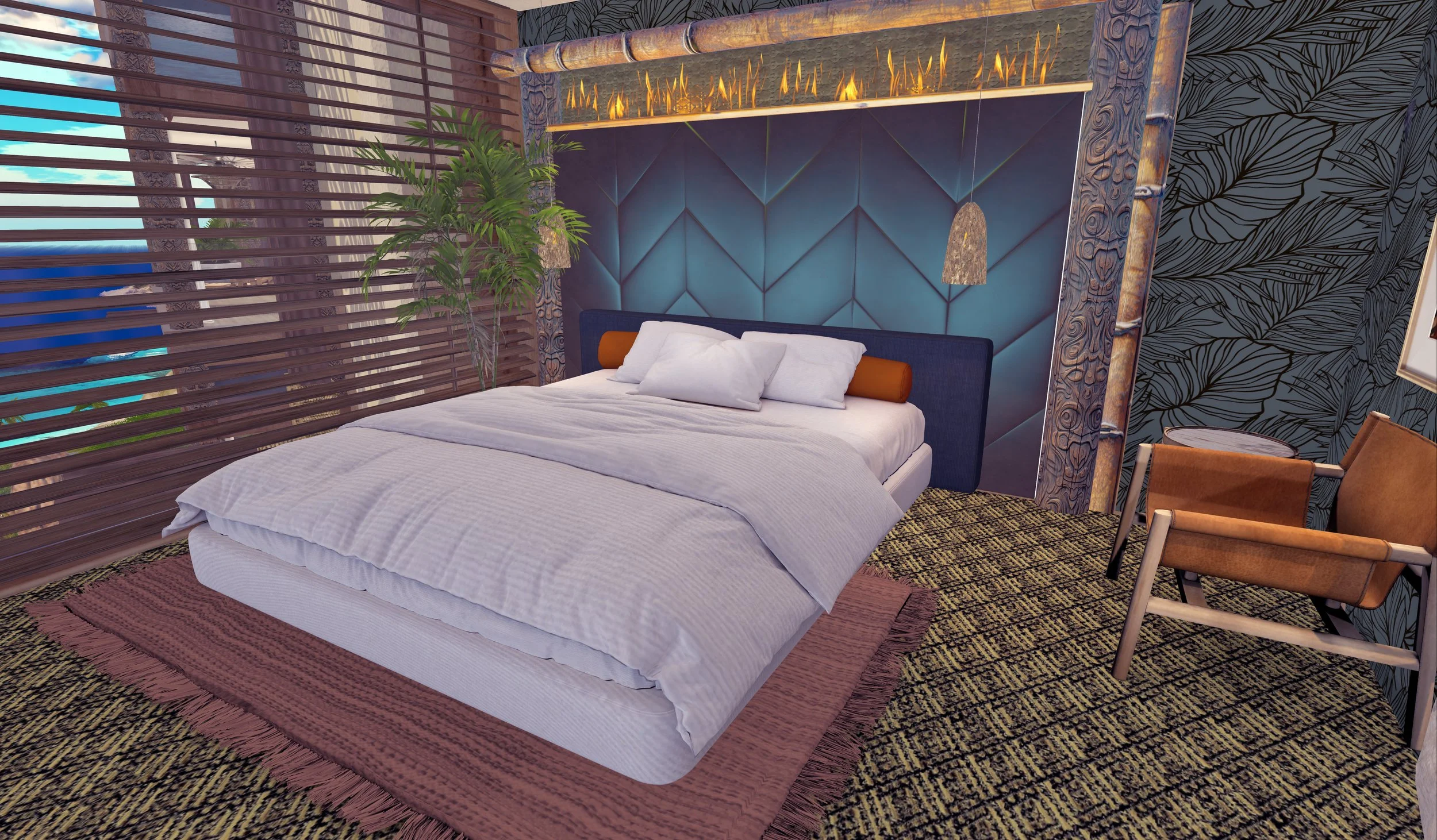 Ahi Cove offers four accommodation types. The Golden Tiki Villas (where we stayed) are adults-only, privately parcelled units with floor-to-ceiling ocean views, a carved bamboo-framed headboard with a feature fireplace, tropical wallpaper, a globe drinks cabinet, and a private lanai with sun loungers.