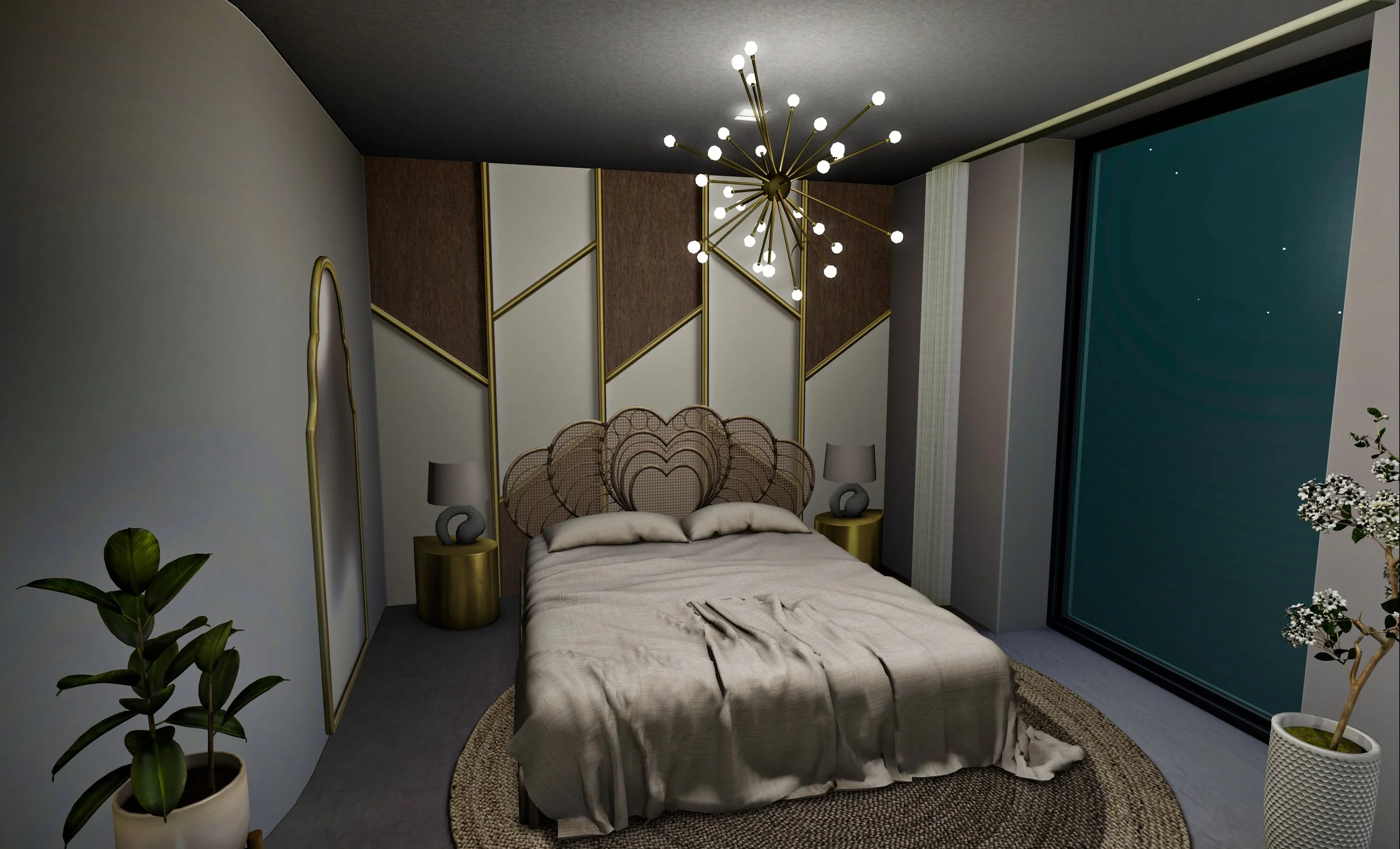 The room is decorated with modern furnishings, including adult furniture such as the "Noveny - Heart Rattan Bed - Adult."